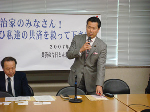 行動では、「共済が会員にとってかけがえのない存在になっている」こと、「保険会社と同様の規制を受ければ、ボランティアで支えられている共済の運営が存続できなくなる実態を理解してほしい」と訴え、要請書を手渡しました。対応した国会議員は「構成員の相互扶助を目的に行なう共済にまで、法の網をかけるのはおかしい」「他の議員とも相談して対応したい」「委員会で取り上げたい」「障害者自立支援法での法案審議と同じやり方で、肝心な部分は政省令で決めようとする」と政府の政治手法を批判する声など、「懇話会」の行動への賛同と激励などの声が各党議員から寄せられました。